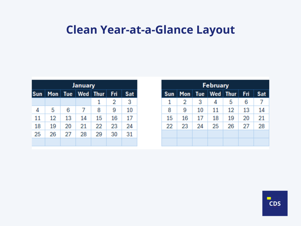 It gives you a clear, easy-to-scan overview of the full year without unnecessary clutter, making it perfect for quick reference, planning or printing.